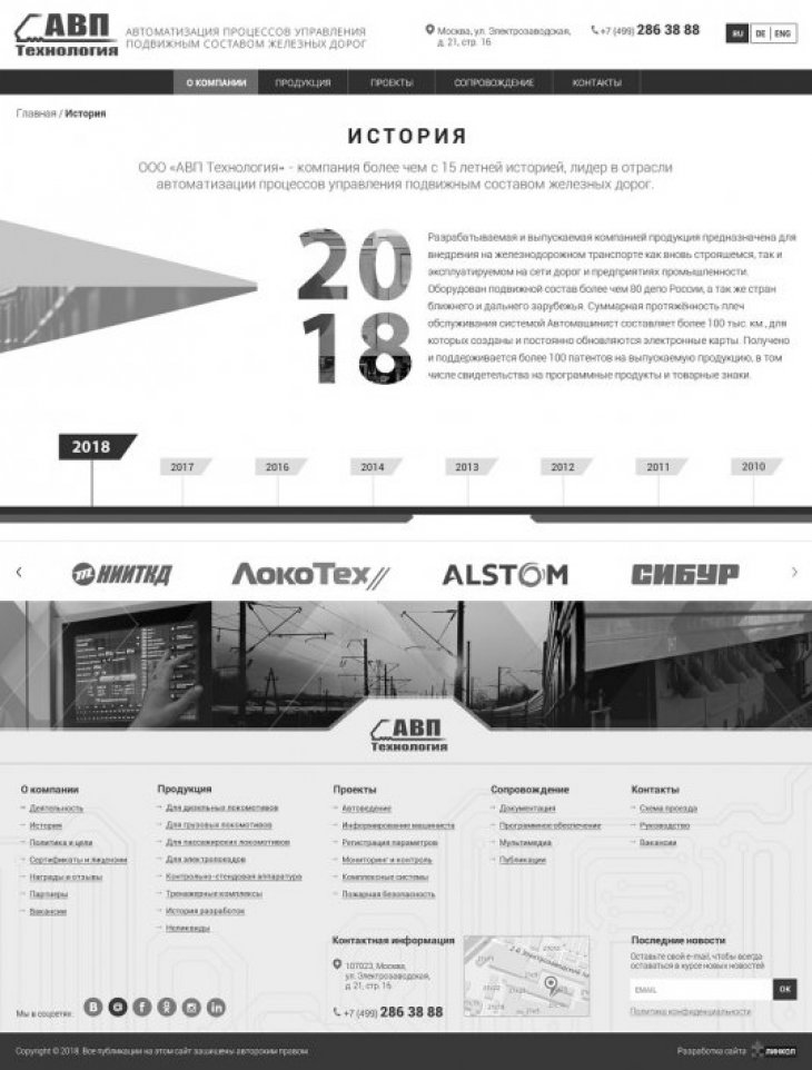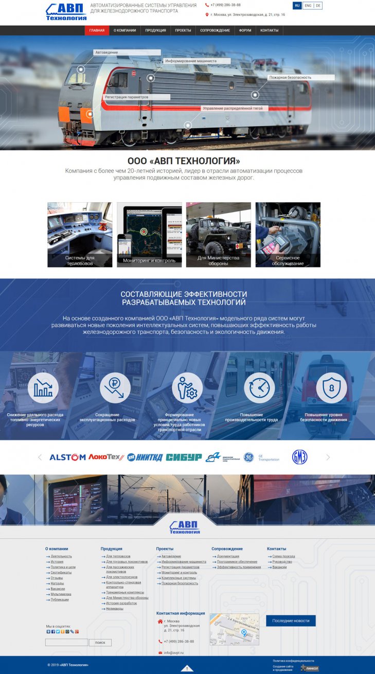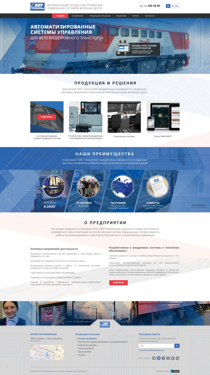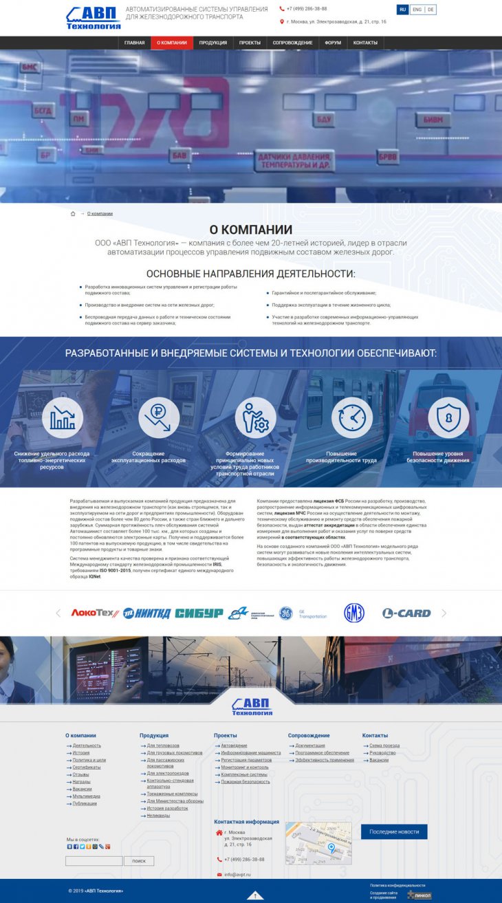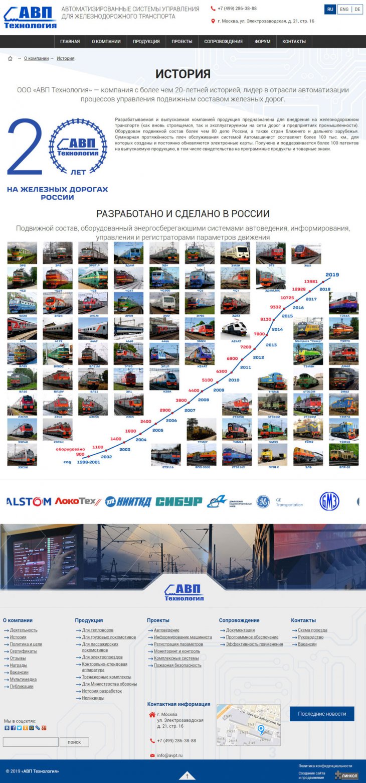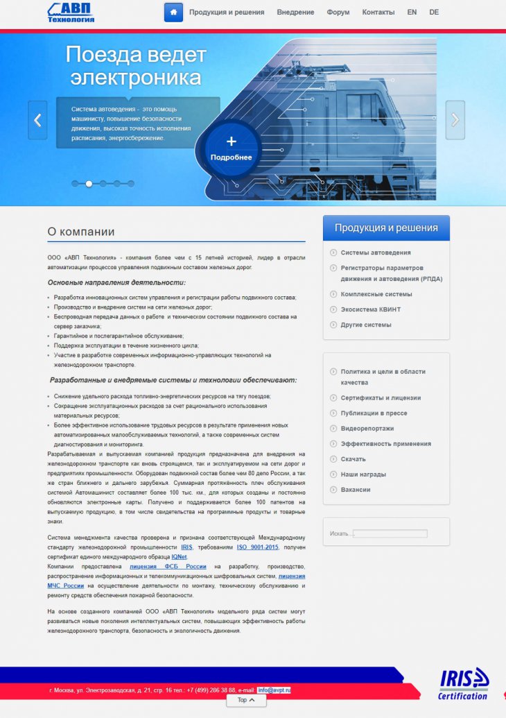 ООО «АВП Технология» — компания с более чем 20-летней историей, лидер в отрасли автоматизации процессов управления подвижным составом железных дорог. Разработка инновационных систем управления и регистрации работы подвижного состава; Производство и внедрение систем на сети железных дорог; Беспроводная передача данных о работе и техническом состоянии подвижного состава на сервер заказчика.
