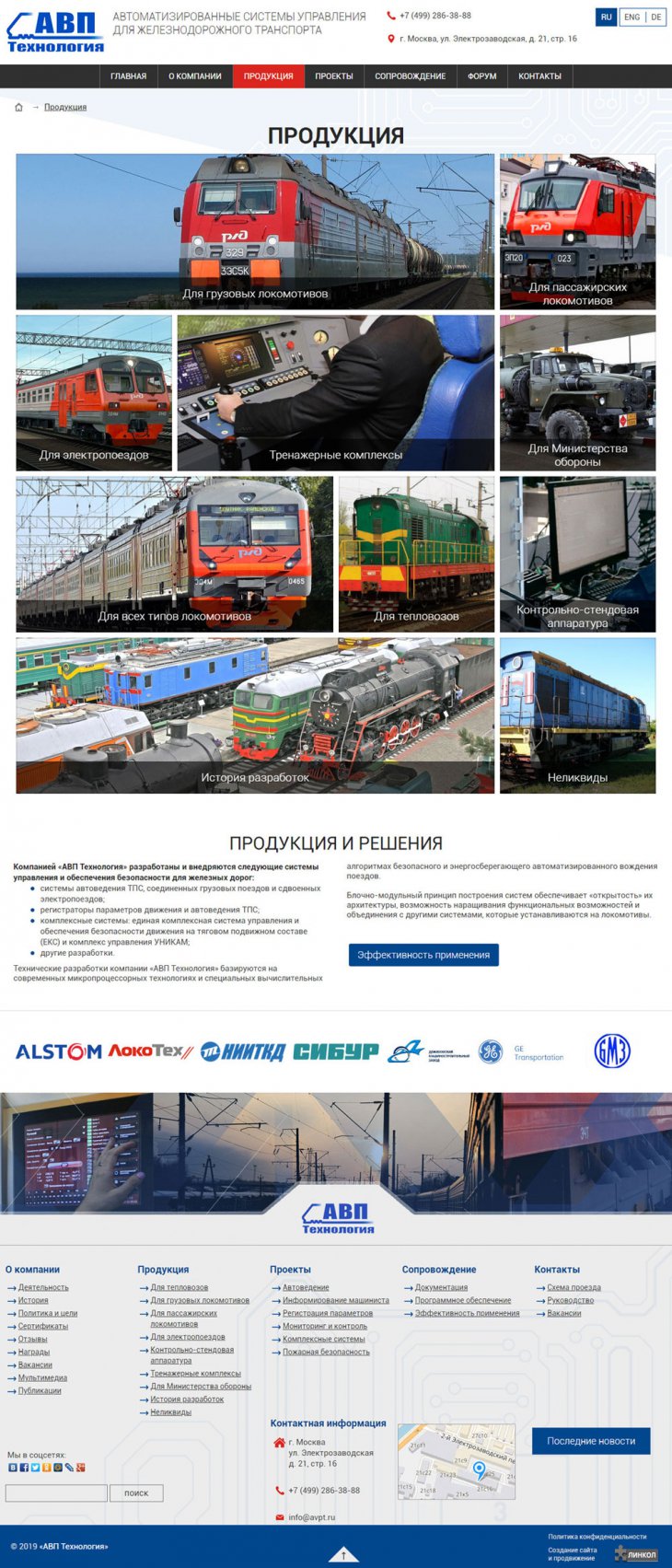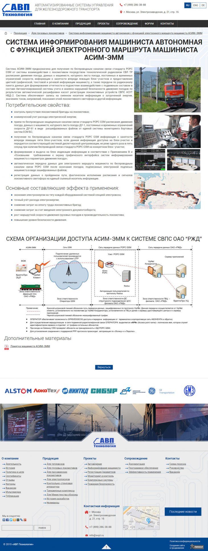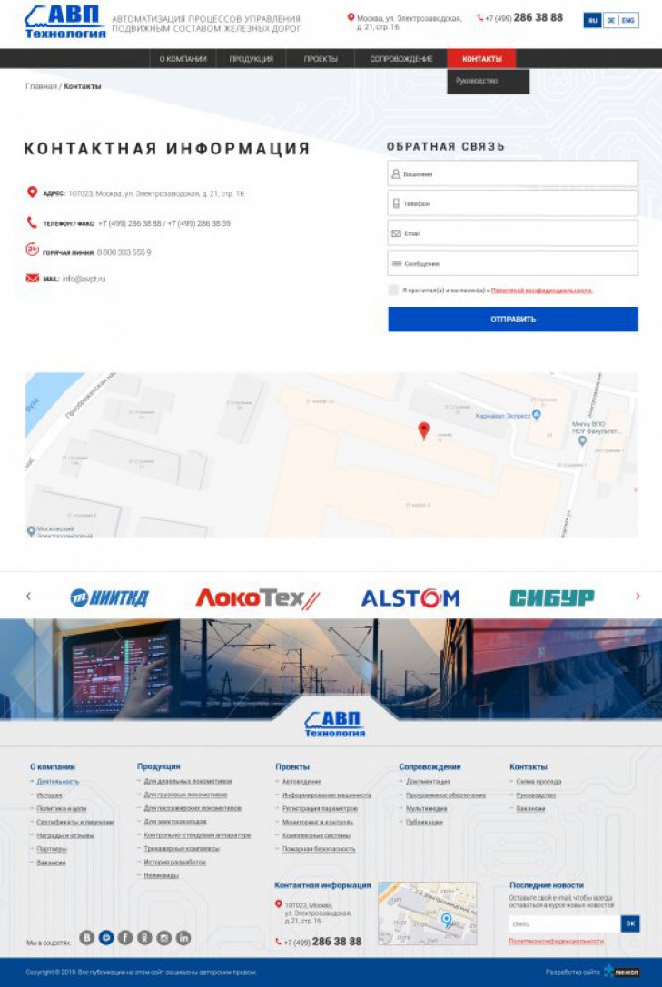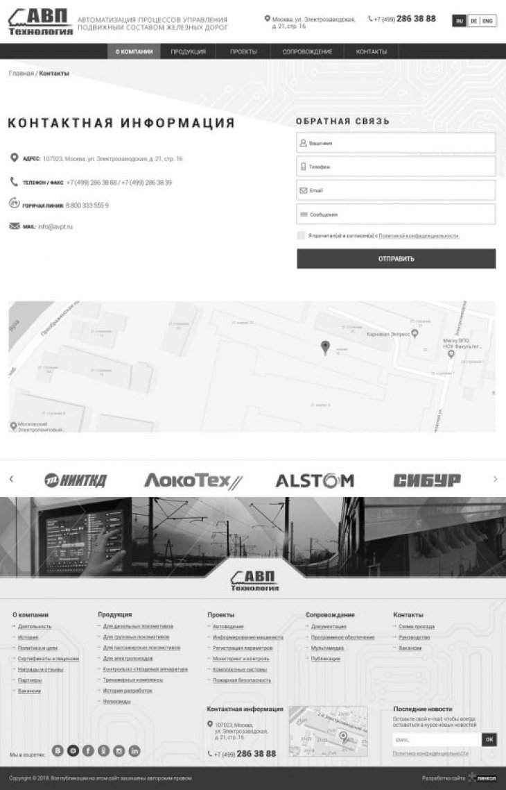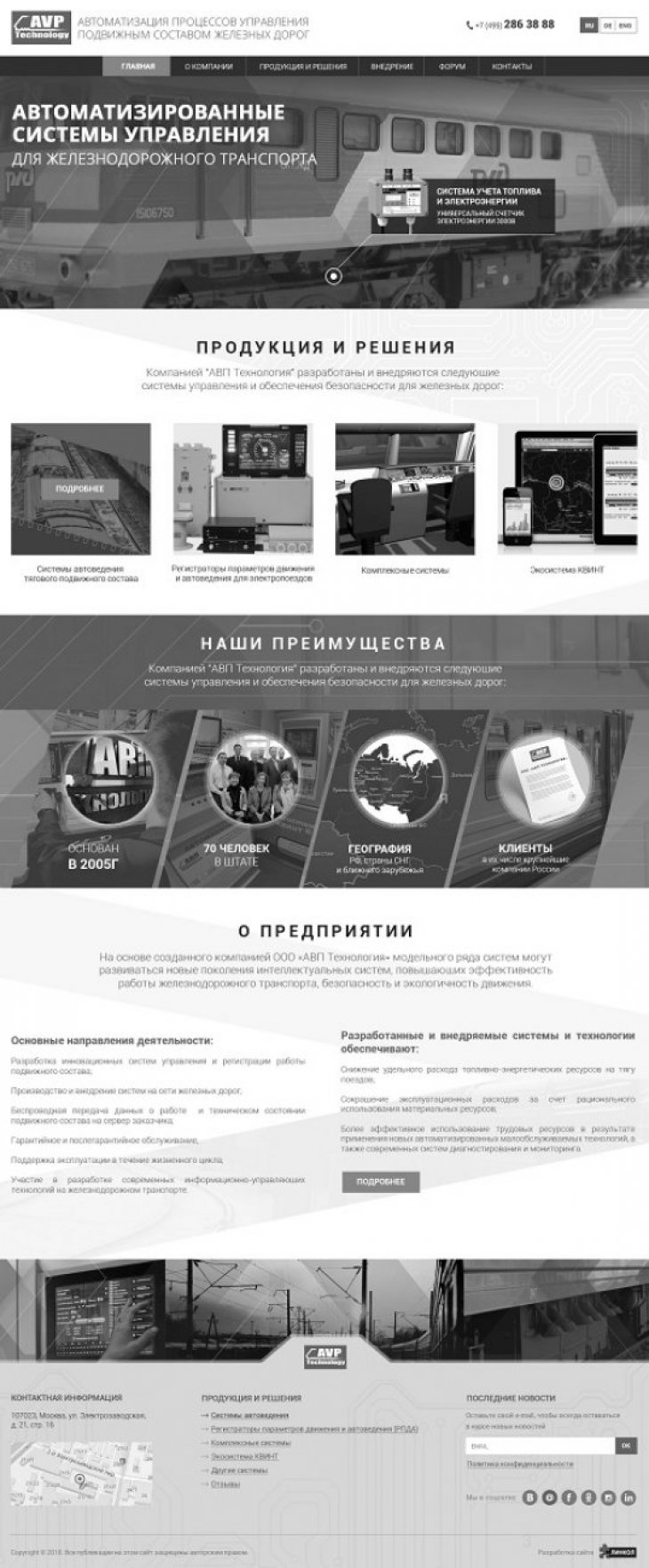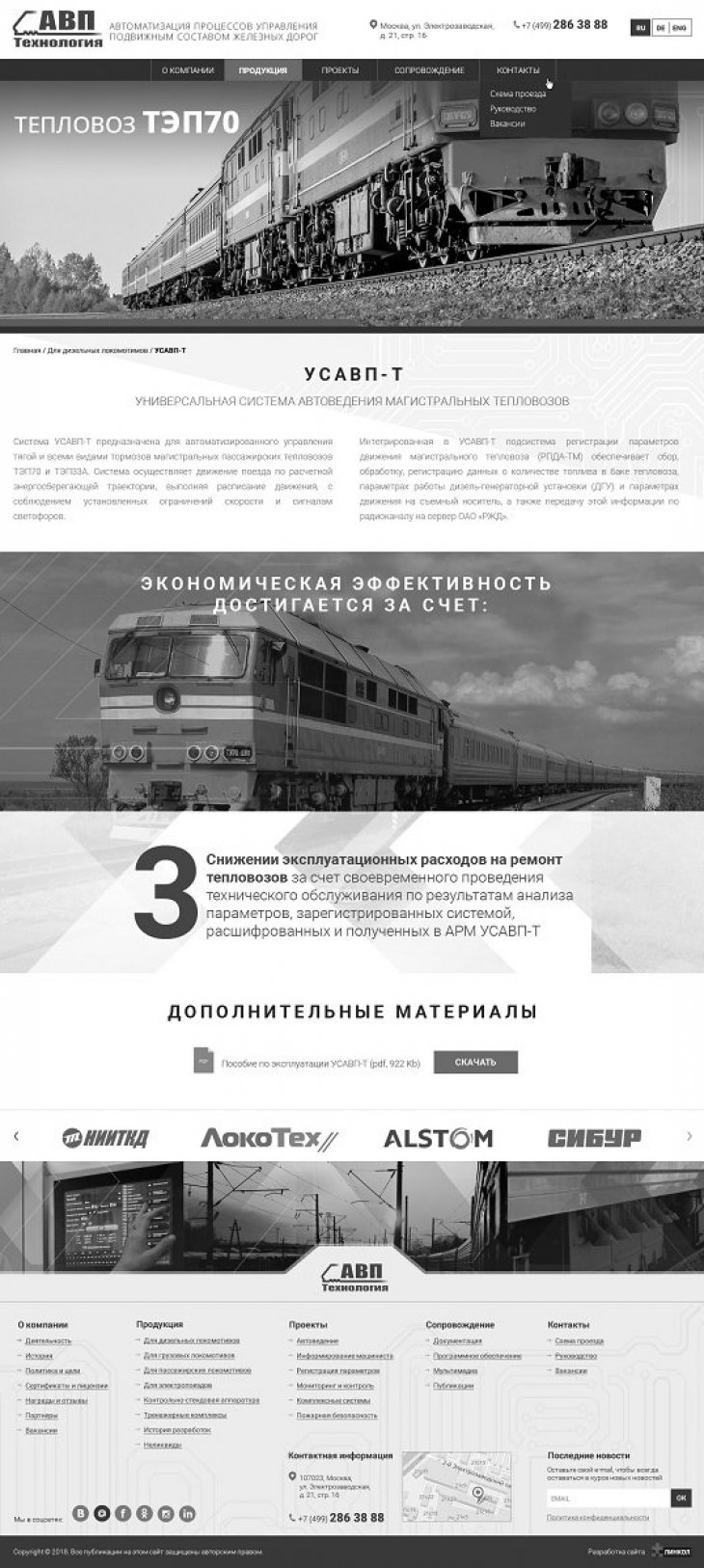 ООО «АВП Технология» — компания с более чем 20-летней историей, лидер в отрасли автоматизации процессов управления подвижным составом железных дорог. Разработка инновационных систем управления и регистрации работы подвижного состава; Производство и внедрение систем на сети железных дорог; Беспроводная передача данных о работе и техническом состоянии подвижного состава на сервер заказчика.
